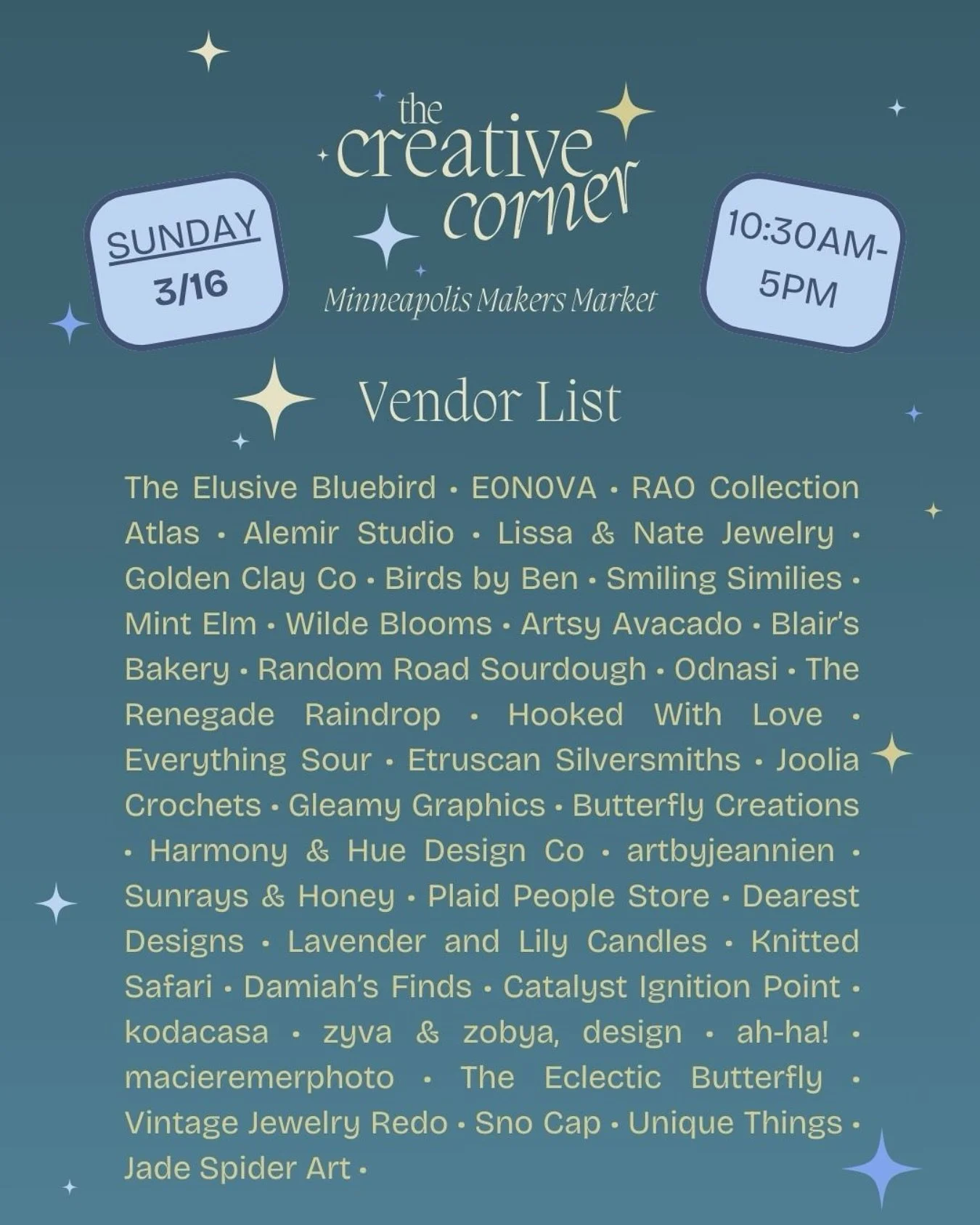 A makers market highlighting talented local Minnesota creatives featuring a wide variety of handmade goods, art, jewelry, textiles, home decor, services and more!
